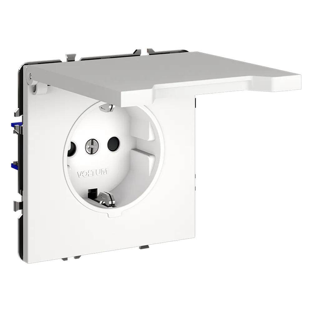 Розетка VOLTUM S70 с заземлением и защитными шторками и откидной крышкой  — это решение максимальной безопасности и эстетики для современного интерьера. Идеально подходит для детских комнат, ванных, прихожих, кухонь и уличных зон под навесом, где важна защита от пыли, брызг и случайного контакта с токоведущими частями.